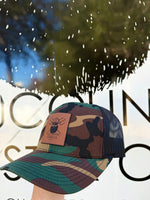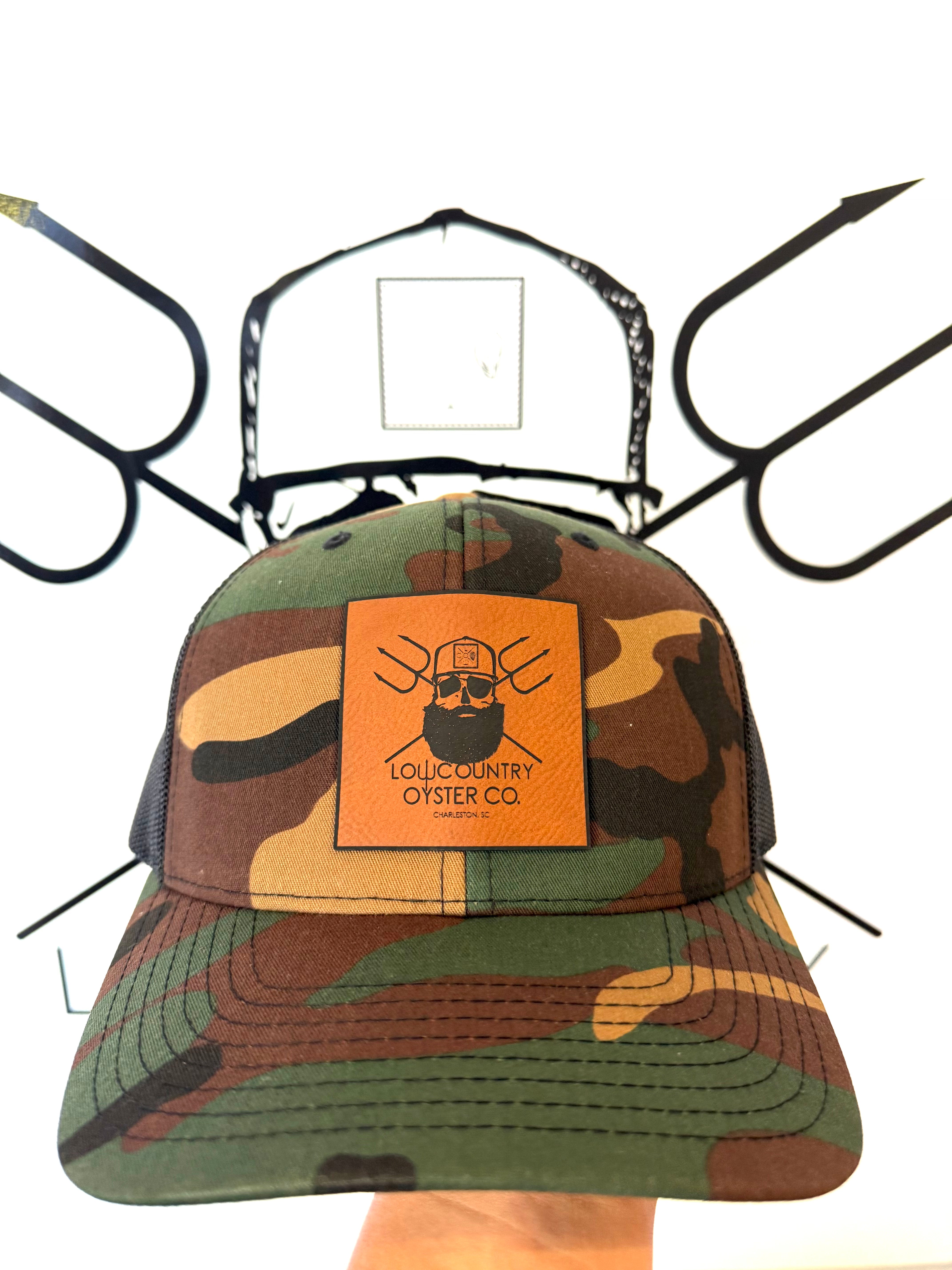 Meet the Lowcountry Trucker - Camo front, black mesh in the back, and a brown leather patch stamped with our logo.